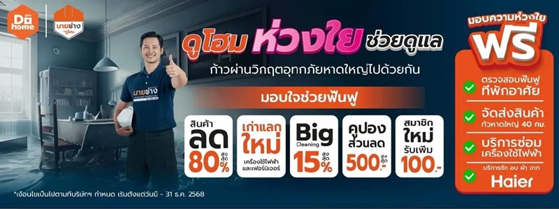 สิทธิพิเศษแทนความห่วงใย เพื่อช่วยเหลือ ผู้ประสบอุทกภัยหาดใหญ่ ตั้งแต่ 1-31 ธันวาคม 2568 นี้ เฉพาะที่ดูโฮม สาขาหาดใหญ่ ติดตามรายละเอียดเพิ่มเติมได้ที่เว็บไซต์ DOHOME, Line official : @Dohome และ Facebook fan page : Dohomeonline หรือสายด่วนโทร. 1746